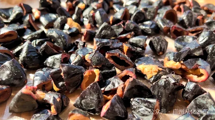 乌榄果实由外至内,从果肉到榄核、榄仁,全身都是“宝”。乌榄的果肉可直接食用或搭配五花肉、鱼肉等食材成为下饭菜,也可晾晒腌制成“榄角”,成为老广人餐桌上必不可缺的“配角”。此外,榄角还可捣碎制成榄角酱,作为调料使用。敲开榄核,里面的榄仁是五仁月饼的果仁之一,也是制作名贵菜肴、高档西饼的绝佳原材料。
