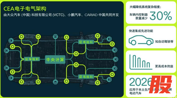 1月28日,大众中国宣布其专为中国市场打造的CEA电子电气架构已如期完成交付,这是大众汽车(中国)科技、CARIAD中国与小鹏汽车合作的关键成果。据大众汽车集团(中国)董事长兼首席执行官贝瑞德介绍,自2026年起,国产大众汽车品牌的纯电动车型将搭载全新的CEA电子电气架构——China Electronic Architecture。